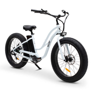 Is the Fat Pax the best electric cruiser ever made? We think so! The 52 volt battery provides high capacity and high torque, meaning that you'll be able to ride up to 80kms on any type of terrain with ease. The 4-inch fat tyres help to absorb bumps for a smoother ride. Hydraulic disk brakes will safely bring you to a stop, and the step-through frame will allow you to get on and off the bike with ease. The control screen mounted on the handlebars gives you five levels of pedal assist to choose from. You can also use the thumb throttle and take it easy, riding your step-through e-bike like a moped. If you're looking for a new step-through electric fat bike, you won't go wrong when you buy a Murf.
